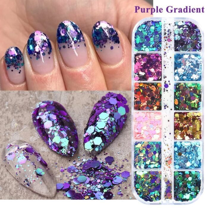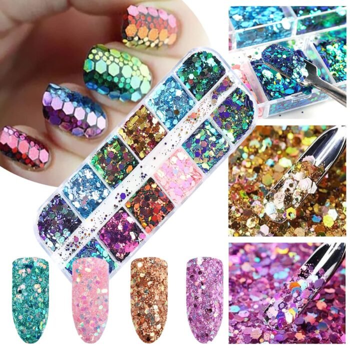 Various Colors: Package contents 12 colors chunky nail glitter flakes, Mixed colors glitter in a box, can protect it from spilling out, easy to store and carry.can protect it from spilling out, you can get pink, blue, green, purple etc. The colors vary from view angle and background.