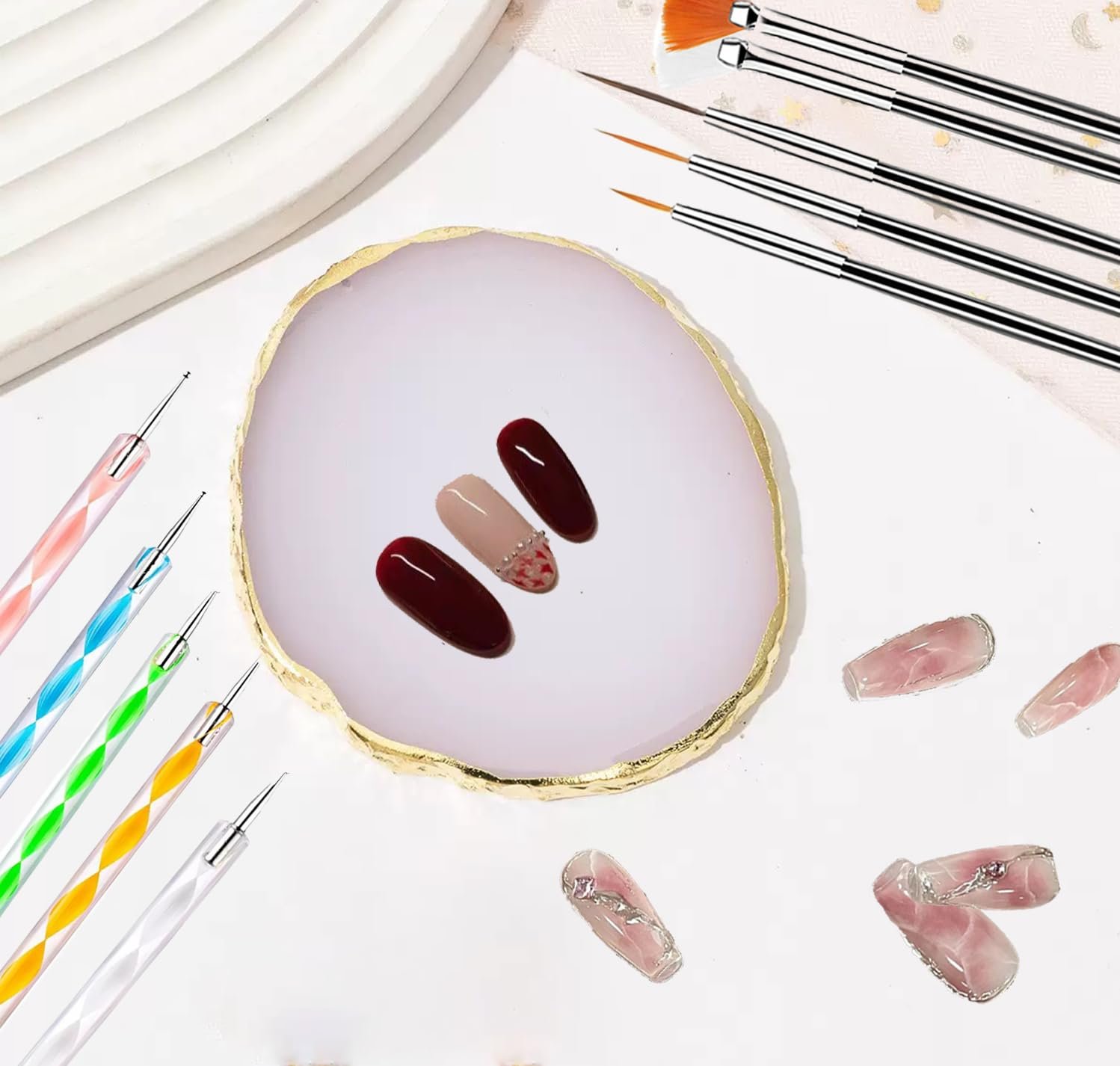【1 Nail Art Palette】 Beautiful agate stone style, not only can you mix colors, but also can be used as a nail art display and shooting props. Made of high quality resin material, the nail polish palette has a smooth surface and feels comfortable in hand. Made of high-quality materials, non-deformation, non-corroding, durable for longer use. Very easy to clean, just rinse with water and dry with paper.