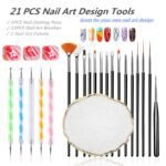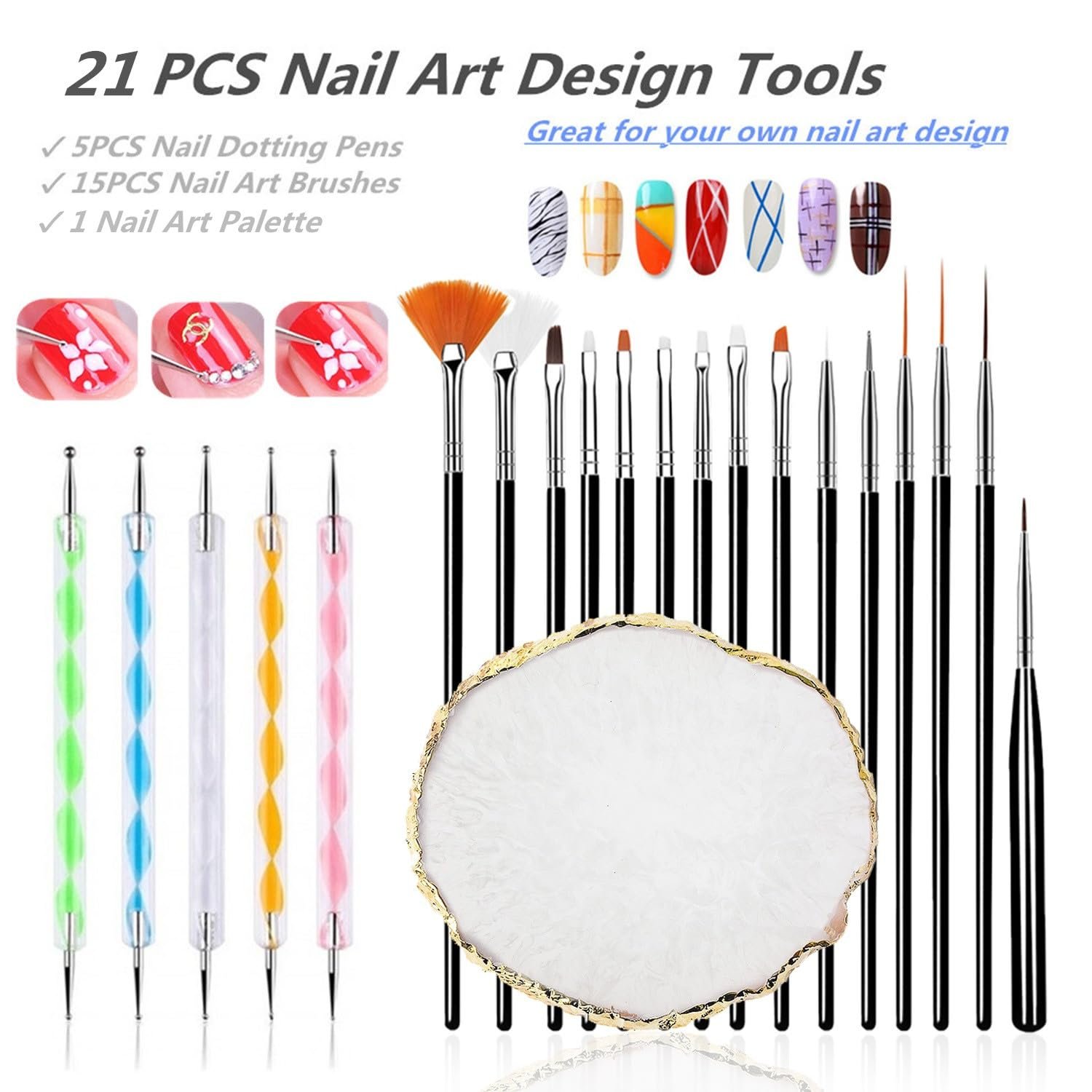 【21 Pcs in 1 Set Nail Art Design Tools】 Includes 1 pcs pink resin nail art palette, 5 pcs nail dotting tools, 15 pcs nail brushes. Use nail art painting palette to mix colors and use nail brushes to paint, you can easily create the pattern you want. Ideal for Acrylic Nails and Nail Art Tip Dot Paint, professional and perfect nail tools for your nail art design. Enables you create beautiful nail patterns in seconds.