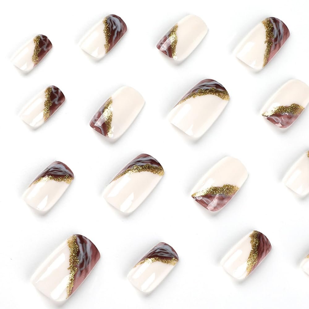 24 Pcs White Press on Nails Medium Square with Marbling Design