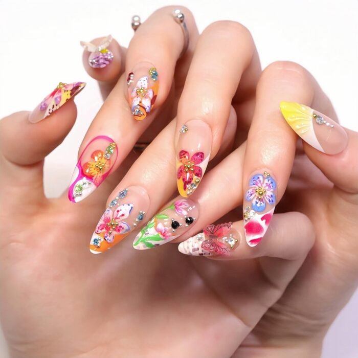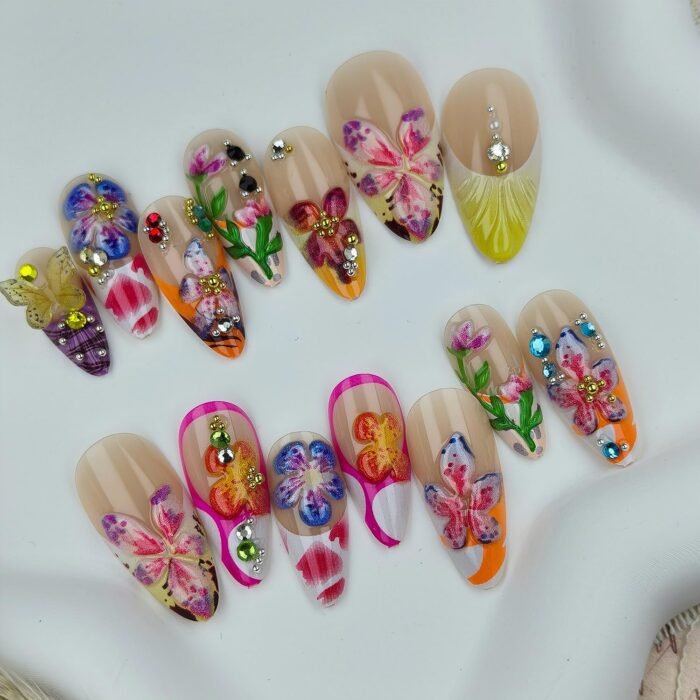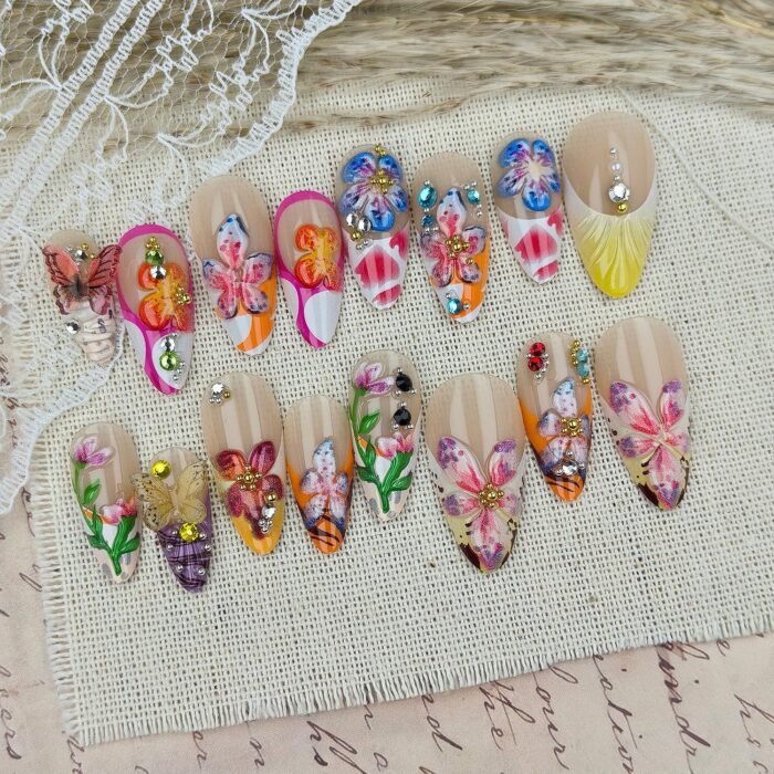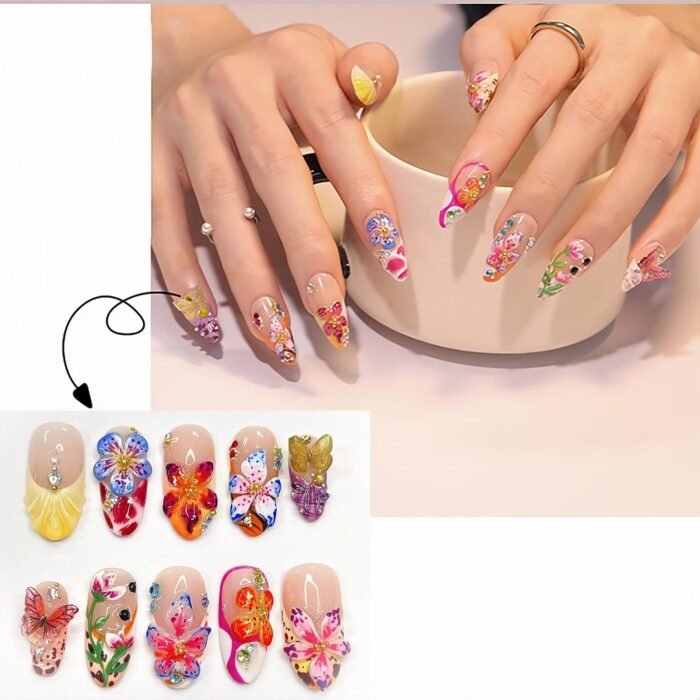 False Nails Set: You will get 1 box of flower press on nails, which contains 24 pcs glue on nails, 1 piece of jelly glue, 1 nail file, 1 wooden stick, the almond press on nails set gives you the effect of a nail salon