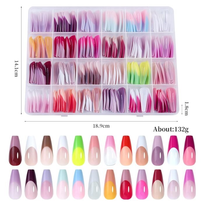 Natural look colorful press on nail:The french tip glue on coffin nails press on with perfect long coffin nail shaped, the top of the long nail press ons are thicker design, bottom has a lighter edge and slight curve. It is can fits perfectly on your real nails. And the french tip false nails are light , so they won’t be a burden to our nail bed after wearing