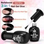 💅MULTI-FUNCTION — The package will come with 2 pcs of 15ml 3 in 1 Nail Gel Glue which not only can be used as nail tips glue, but also can be used as Base Coat and Rhinestone Glue Gel!