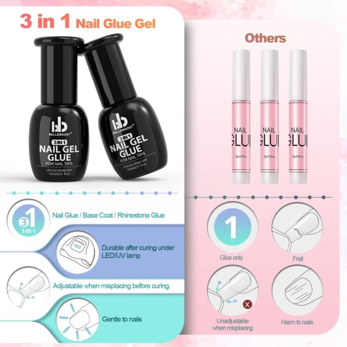 💅MULTI-FUNCTION — The package will come with 2 pcs of 15ml 3 in 1 Nail Gel Glue which not only can be used as nail tips glue, but also can be used as Base Coat and Rhinestone Glue Gel!