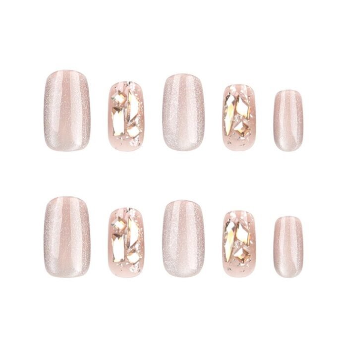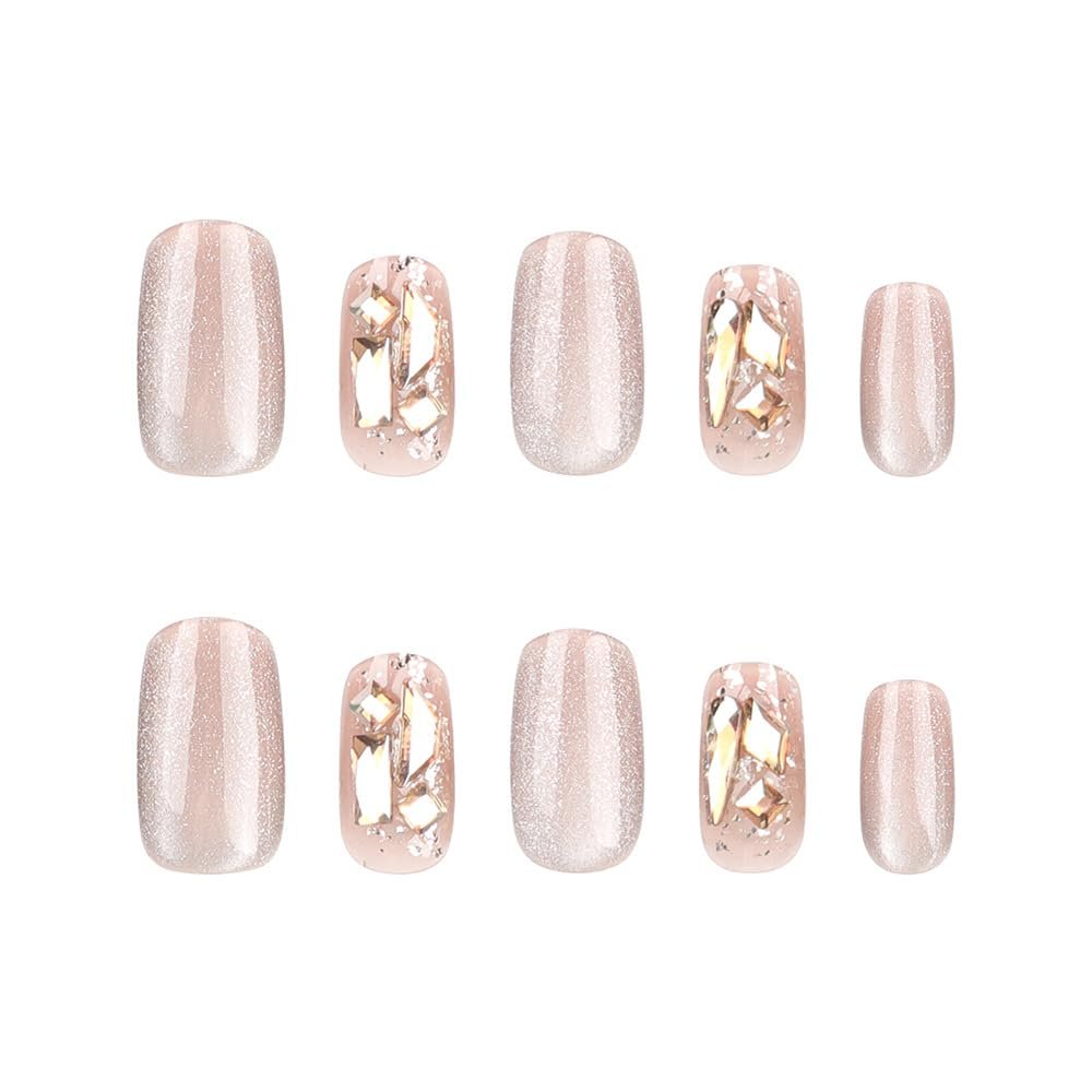 24 Pcs Pink Press on Nails Short Square with Cat’s Eye Rhinestones Glitter Design