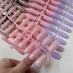 You will get salon nail effect in few minute with out colored fake nails, just file, buffer and clear your fingernails, apply strong nail glue on fake nail tips or fingernails, then put on the false nails and press on them till the nails stay well on fingers.