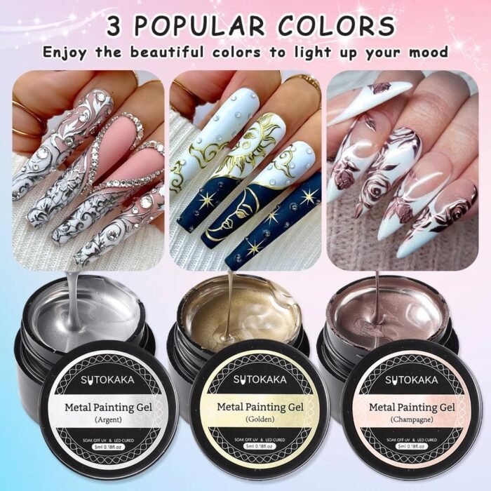 【You Will Get】 Our chrome metallic painting gel set includes 3pcs 0.18 fl oz./5ml painting gel nail polish ( gold, silver, champagne) and 3pcs nail art brushes in different sizes, can be used to outline the lines accurately and draw different patterns to create your own nail art designs.
