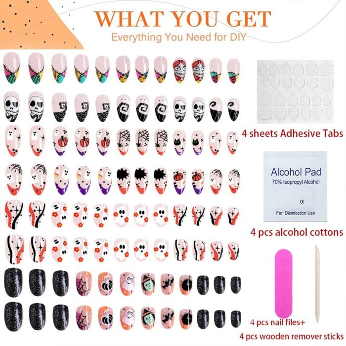 96 pcs fake nails(4 packs)+4 sheets of jelly adhesive tabs+4 pcs nail files+4 pcs wooden remover sticks+4 pcs alcohol cottons