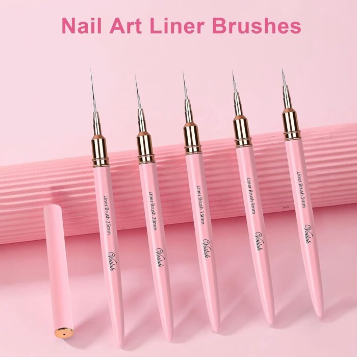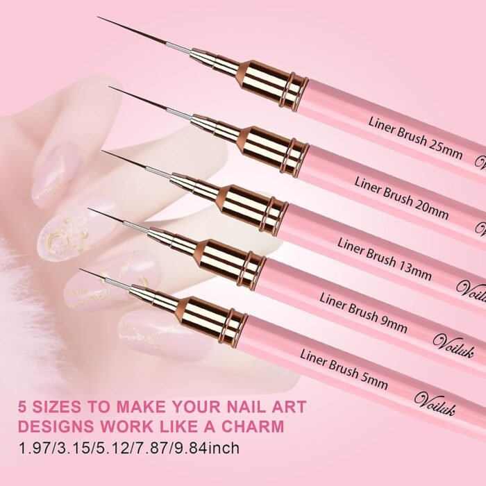 1.【PROFESSIONAL GRADE NAIL ART LINE BRUSHES】: High Quality Detail Brushes Made Of Premium Nylon, Each Process Uses The Most Stringent Quality Testing Of Its Peers To Ensure Durability And Smooth, Soft And Pliable Feel, 5 Different Sizes Of Bristles Can Draw Different Long Lines, Short Lines, Straight Lines Or Curves, And Can Be Used For Different Nail Art Paintings, Such As French Tip Paintings, Flowers, Chevron Patterns, And Gradient Designs Gel Nail Polish Or Gel Paint.