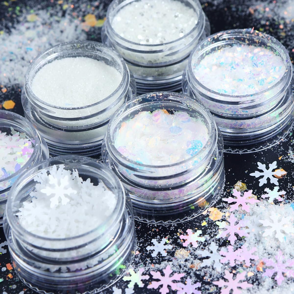 Multiple uses: The snow glitter nail sequins can be used on nails, face and any part of the body as body glitter to give you more sparkling effects. Especially suitable for parties, Christmas and weddings, etc. And can be used as an decoration in phone cases, wallet, jewelry making, greeting cards, mirrors, DIY crafts, etc.