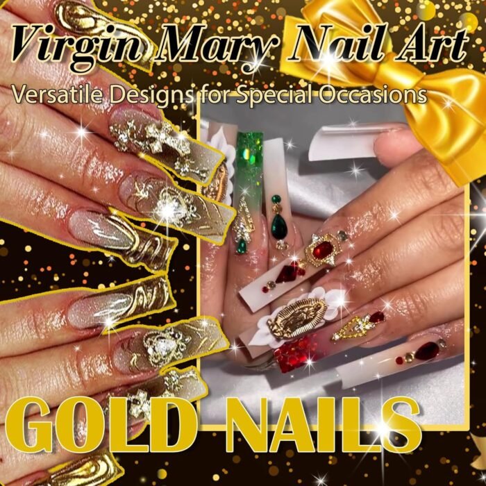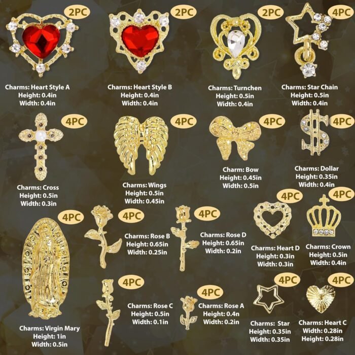 Gold Nail Charms: Each charm is made from high-quality metal, ensuring durability and a luxurious finish that won’t fade or tarnish easily. This set includes a diverse range of designs, from religious symbols like crosses and Virgin Mary charms to classic shapes like hearts, stars, and roses.