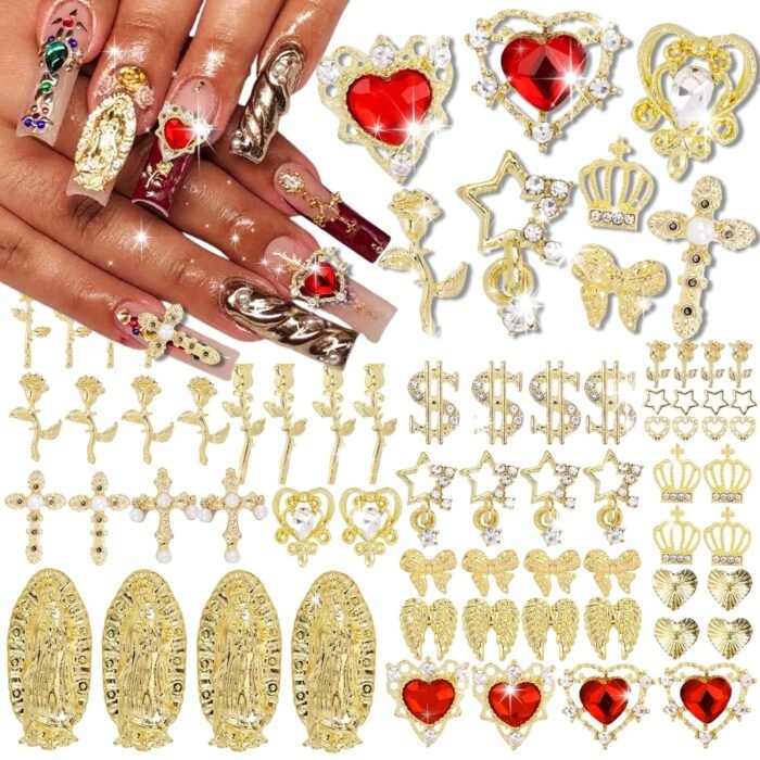 Transform your nail art with our 66PCS Gold Nail Charms Set, featuring an exquisite collection of luxury red and gold charms and gems, including a variety of intricately designed pieces such as metal crosses, hearts, roses, crowns, stars, and Virgin Mary Christian charms.