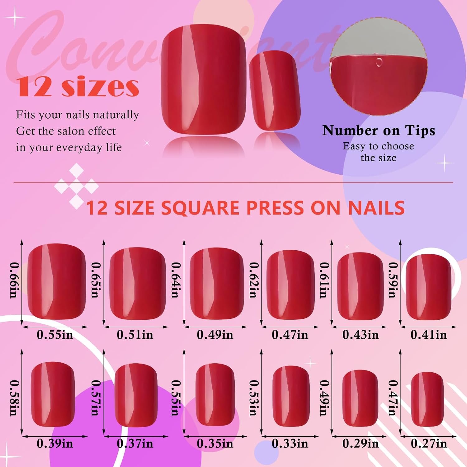 Various size for all fingernails: there have 12 different sizes (0-11) for different fingers, easy to keep track of, and convenient to choose. It is great coverage whether you have small/medium/large hands, and will makes your nails looks natural and nice