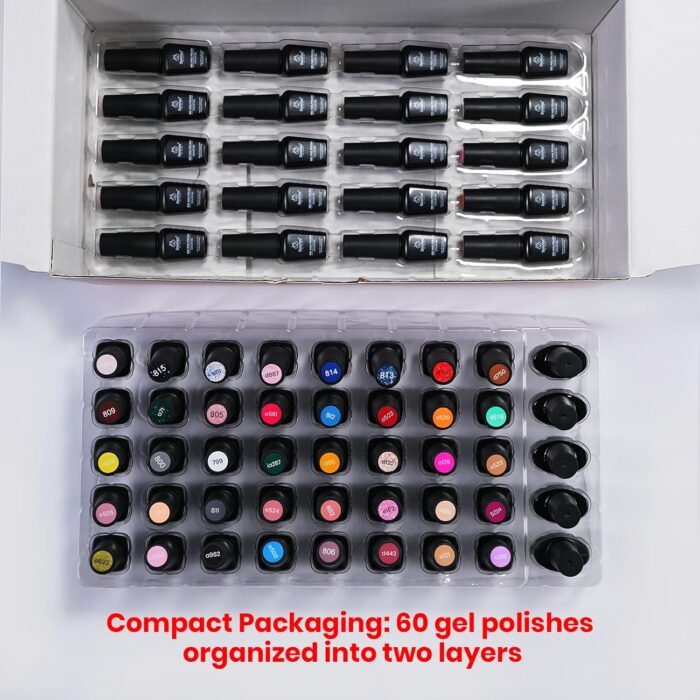 Beetles 60 Color Gel Set: With the beetles gel nail polish set, you get 60 classic and fashionable colors , 2 x 7.5ml gel base coat and 2×glossy & matte Top Coat, 1 x Nail Buffer , 1 x Nail File, 1 x Nail Clipper , 1 x Cuticle Stick, to suit all occasions and seasons. Whether it’s a casual day, a gathering with friends or a ceremonial event, these beetle gel nail polish colors can match any look you wear.
