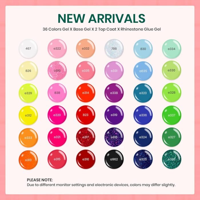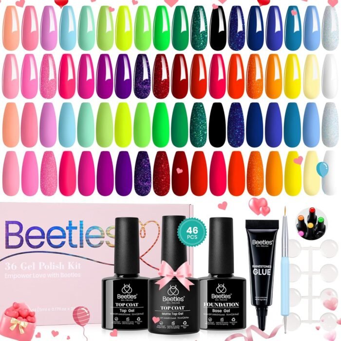 【Beetles Neon Carnival Party】Our Rainbow Nails Set includes 36*Mini Color Gel (0.17oz/5ml each bottle), 3*Glossy & Matte Top Coat and Base Coat (0.25oz/7.5ml each bottle), 5 Pack*Color Swatch Dots, 1*Long Liner Brush Dotting Pen and 1*Rhinestone Gel(0.17oz/5g each bottle). 36 trendy colors perfect for all seasons and everyday life!