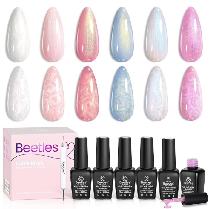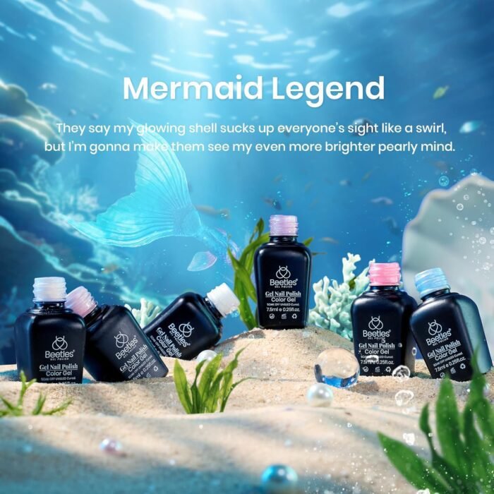 Beetles 2024 New Mermaid Gel Polish Set: The package includes 6 spring summer colors, 7.5ML/0.25fl oz gel polish with a mermaid unique designbeauty gift sets. This is a 2-in-1 shimmer gel polish; not only can it be a pearl gel polish but also a swirl thread shell nail gel. Color Numbers are: c308-c309-c310-c311-c312-c313.
