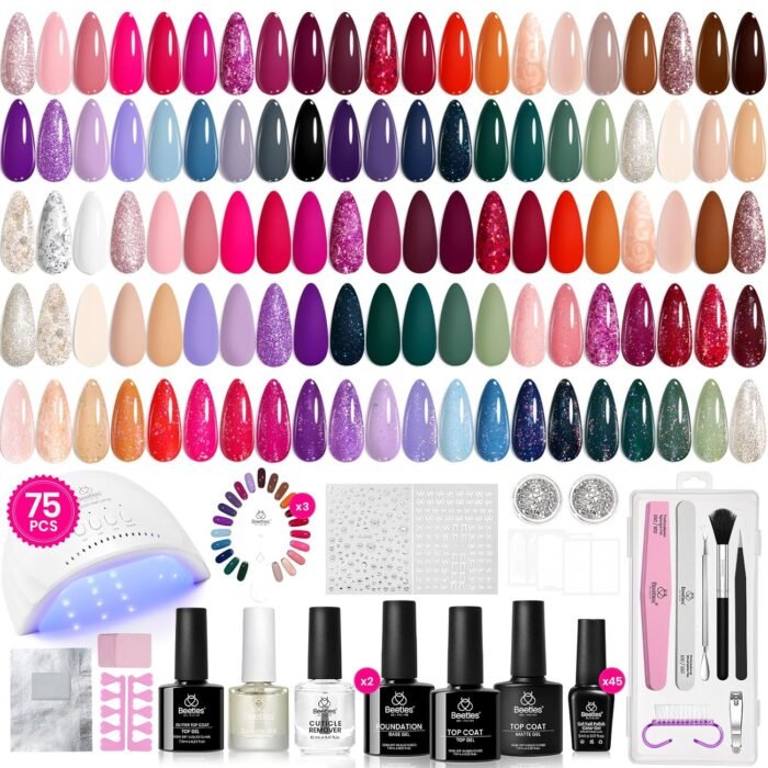 75 PCS Gel Nail Polish Kit: This is a gel nail kit with super multi-color gel nail polish.It includes 45 bottles of classic gel nail polish, 2* base coat, 1* no wipe top coat, 1* matte top coat, 1* glitter top coat, 1* cuticle oil, 1* professional nail lamp, 5* Stickers and some nail tools.The nail set has all the colors you need, You don’t need to go to a nail salon anymore, you can create all kinds of beautiful nail styles at home