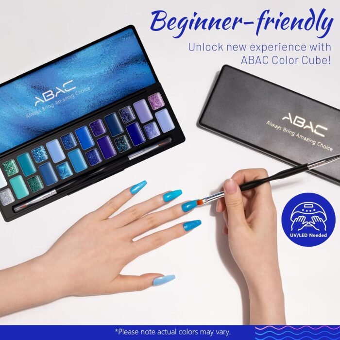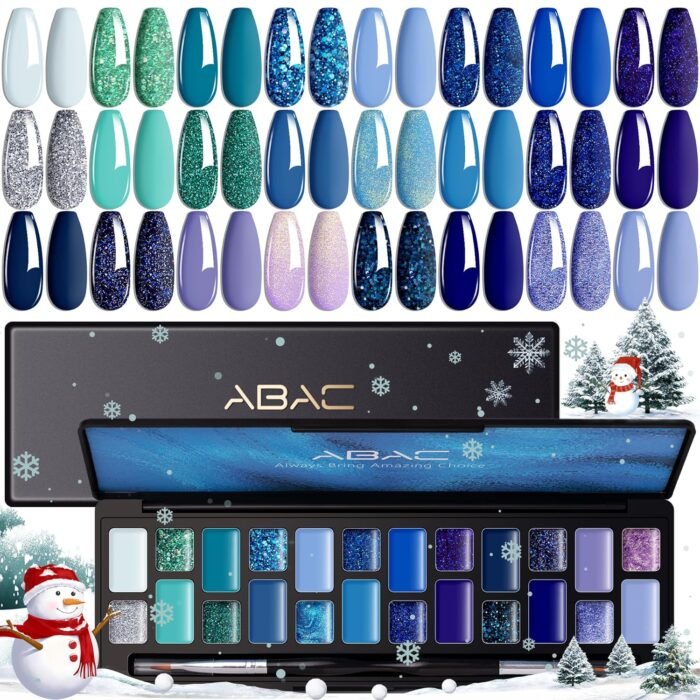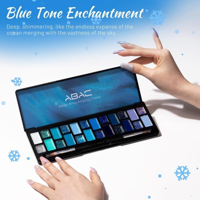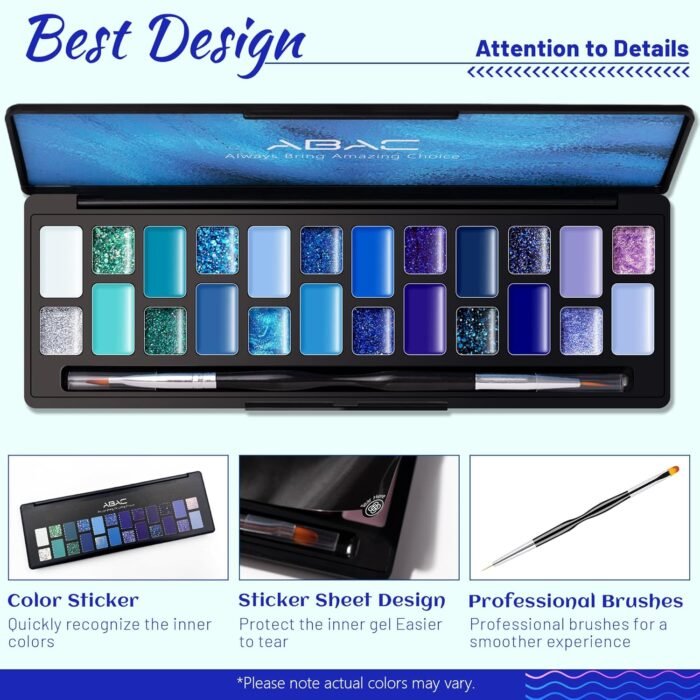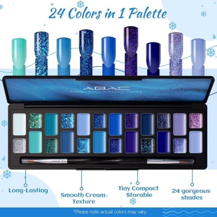 Blue Glitter Gel Nail Polish Set:ABAC blue glitter solid gel polish with 24 well-selected daily routine colors. Can be worn alone, or as color base and practically work with kinds of Manicure Styles. With 1* nail brush, Upgraded the gel form of the regular liquid to solid, the weight of heavy to light, bottles & jars to 1 palette – 24 colors in 1