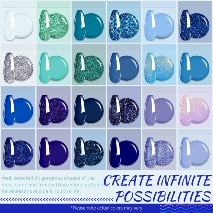 Tiny& Compact& Storable: The blue glitter solid gel polish palette for easy storage does not occupy space, say goodbye to the clutter,Tiny but worthy: 24 colors in 1, more color choices. Ideal for worldwide travel. # NOTE: Need Base&Top Coats, and Lamp Curing!