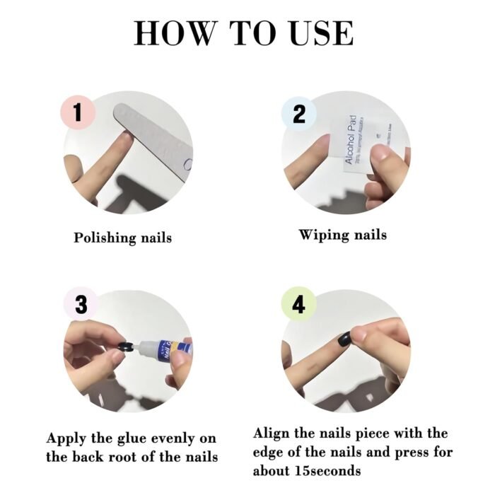 [Easy to Use] After trimming and cleaning your nails, choose a false nail that is suitable for your own nail size, apply with glue, and then press it on your nails for 15 seconds, then you can have a perfect new nail.