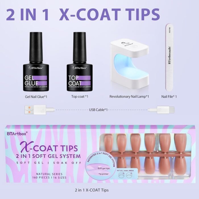 ALL IN ONE KIT: BTArtbox press on nails kit includes 160pcs short coffin XCOATTIPS,10ml 4-in-1 nail glue gel, 10 ml top coat, a portable UV/LED nail lamp and 1pc nail file. We are ready for all you need. You can easily make your nails extend and even nail novices can easily enjoy the fun of nail DIY!