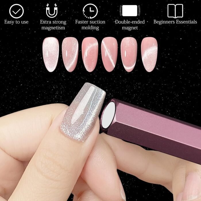 Efficient Cat Eye Magnet: The cat eye magnet has strong magnetism at both ends, which can easily attract the particles in the magnetic gel nail polish to create various professional manicure patterns on the nail tips. Super strong magnetism allows you to easily achieve the cat-eye effect in 5-10 seconds. (Note: This tool must be used with cat eye polish gel)