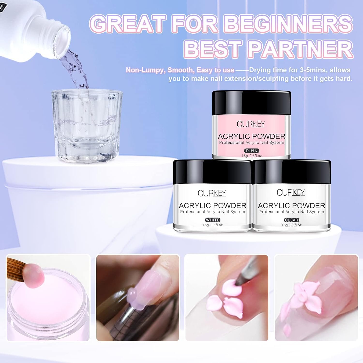 【 Acrylic Nail Set for Beginners】Curkey acrylic nail powder is made from advanced skills which are non-yellowing and long-lasting. Healthy and environmentally friendly, high strength, durability, and no lifting which can ensure the best bond to the natural nail plate and ensures an impeccable shine. Easy to use with nail acrylic powder which girls can shape your 3D nails as your like!