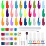 【What You Get】Dip Nails Powder Starter Kit including 30*0.35oz dip powder, 4*0.5floz dip liquid set, 1* Nail Brush, 1*Nail file, 2*Substitute brush, 2*Nail Stick, 1*Cuticle Pusher. A kit containing all your nail art needs.