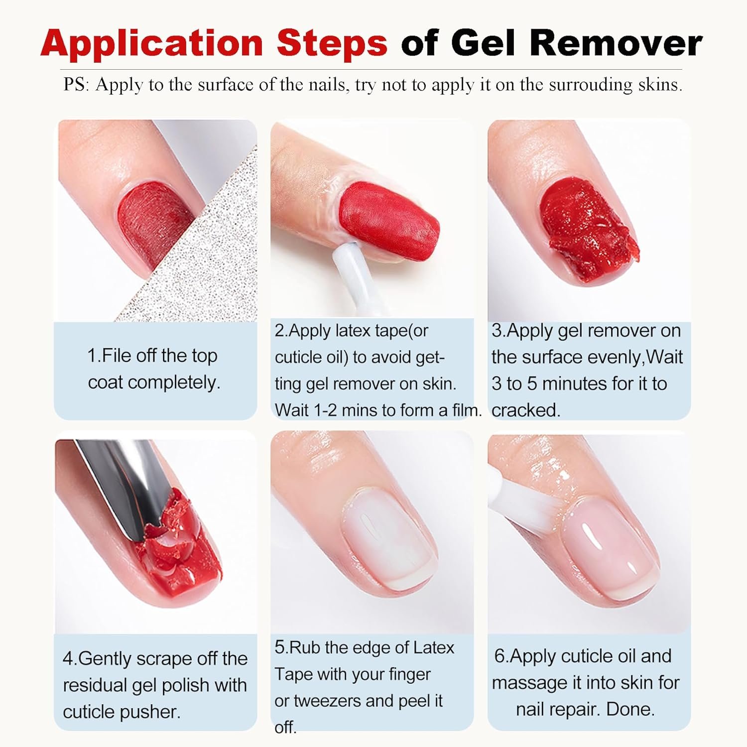 【Easy Removal Steps】1. Remove the topcoat with a nail file 2. Apply liquid latex on the skin around the nail (if any) 3. Apply gel remover and wait 3-5 minutes. Gel nail polish will burst and then it is easy to scrape off with the included tool. Note: For poly gel, dipping powder, building gel, acrylic powder, the effect is weakened, and it takes several more applications to achieve the removal effect.