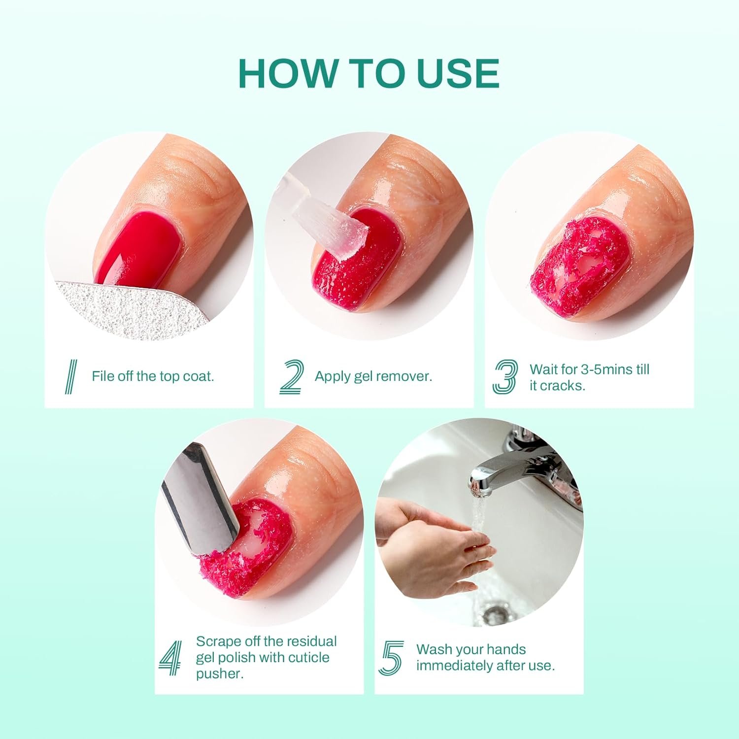 Warm Tips: When using nail polish remover gel, if you accidentally drop it on your skin, please rinse it off with water immediately. When removing nail polish, please remove the top coat layer first so that the nail polish will burst automatically.