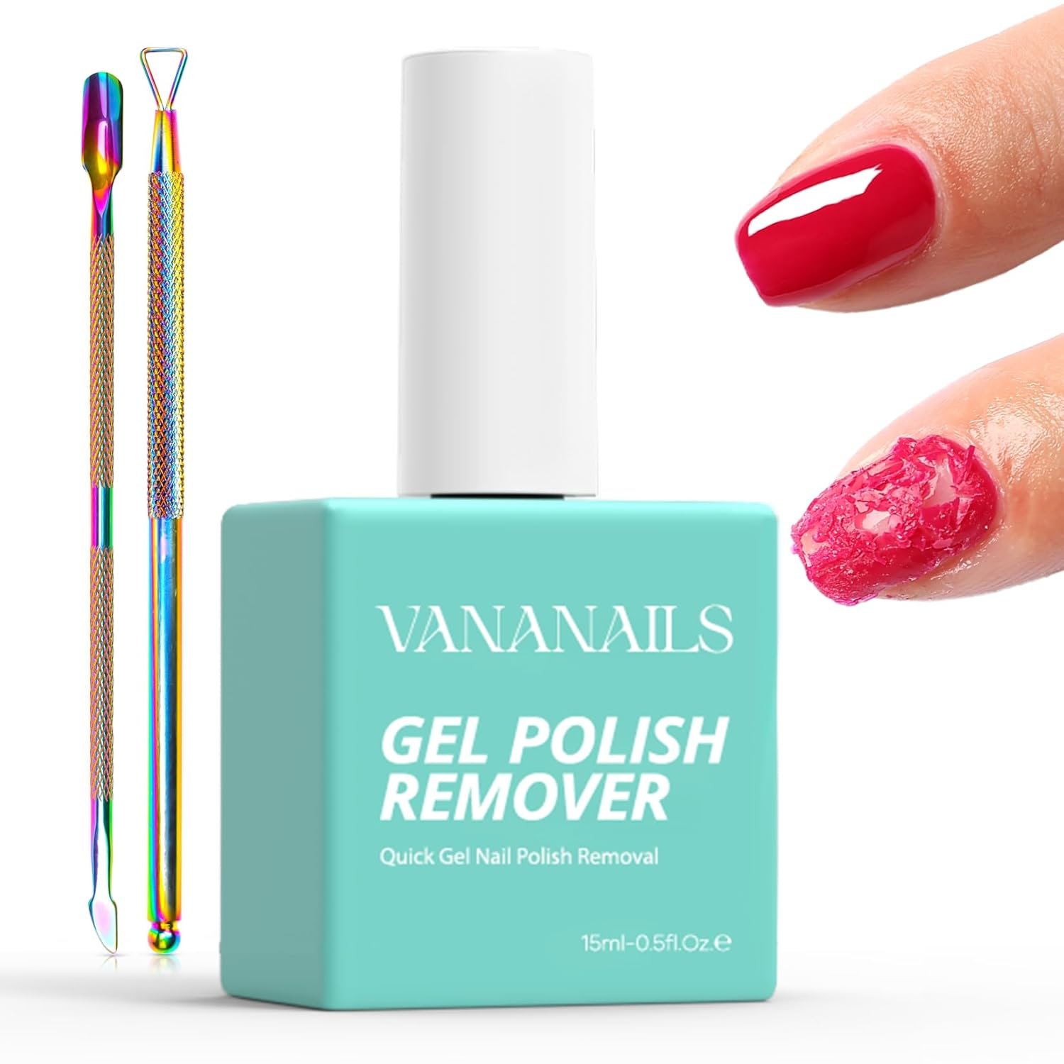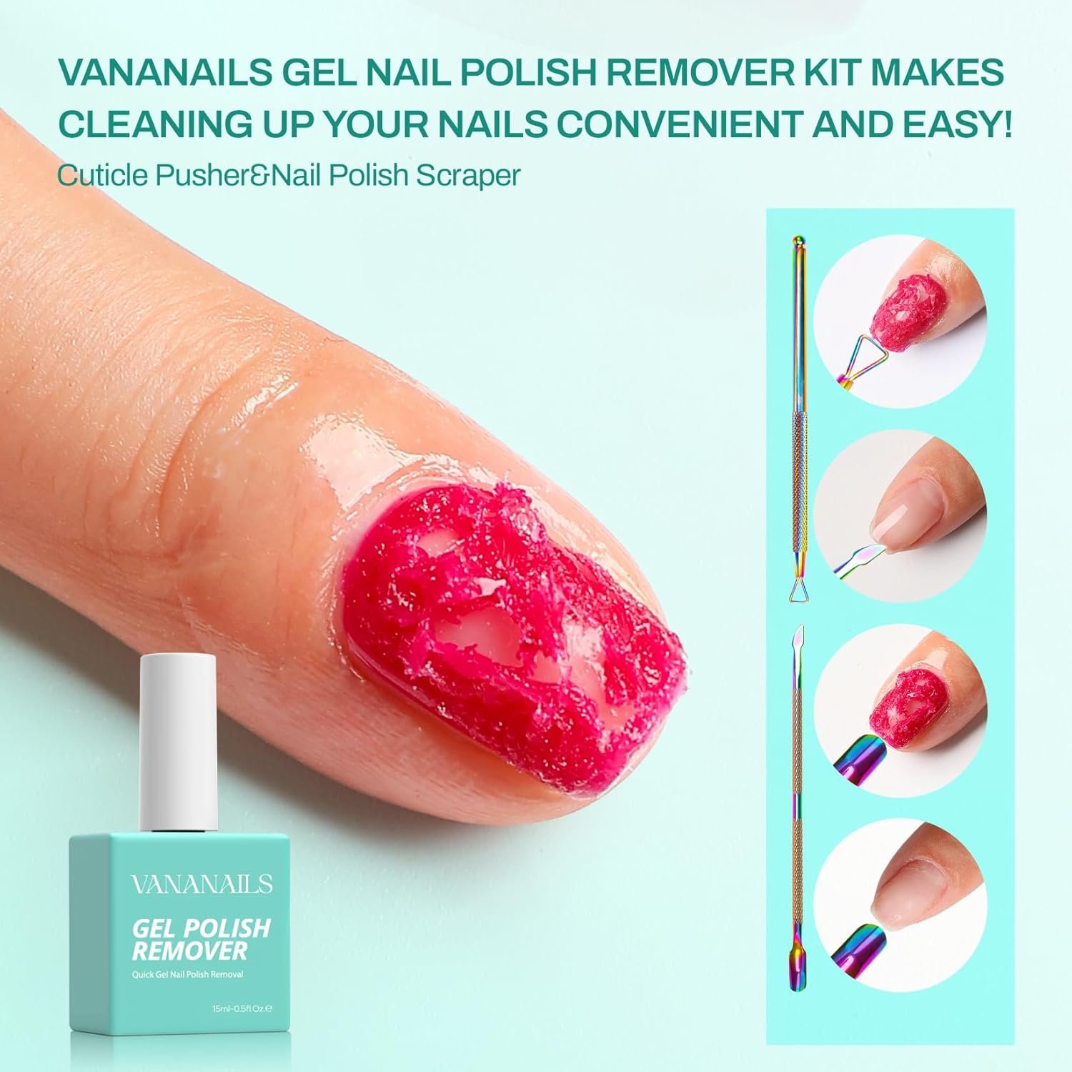 The Best Kit For Gel Polish Remover: VANANAILS gel nail polish remover kit contains 1 x 15ml gel nail remover, 1 x cuticle pusher, 1 x gel polish scraper. It removes gel nail polish quickly, just apply the gel polish remover for nails and wait for 3-5 minutes, removes your nails very easily without hurting your nails.