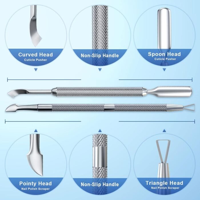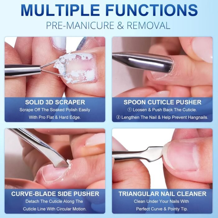 Durable and Ergonomic Nail Cuticle Pusher:This quick gel nail polish remover comes a stainless steel triangle cuticle peeler scraper remover tool,the curved end is designed to match the normal curvature of the nail, great design makes it more thorough removal of nail polish on the corner.Double head design to meet different needs.Better and more convenient to remove nail polish