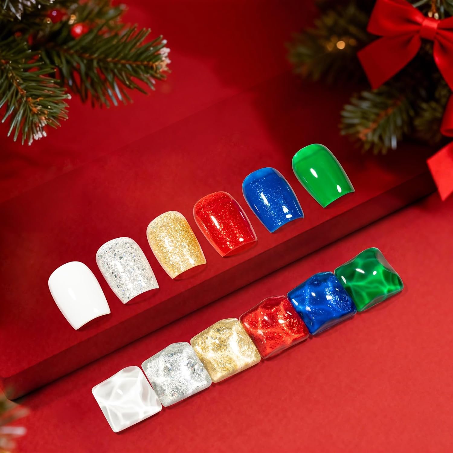 Festive Holiday Colors: 6 joyful shades: Christmas red, evergreen, ice blue, snow white, gold glitter, silver glitter