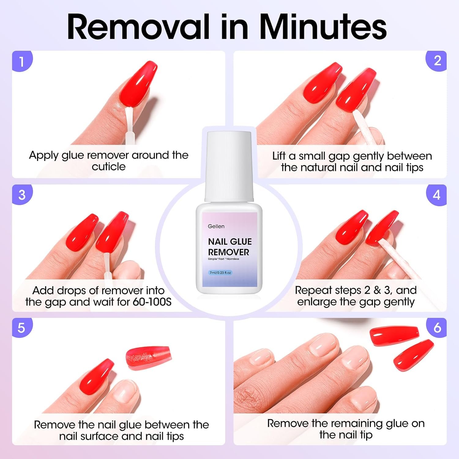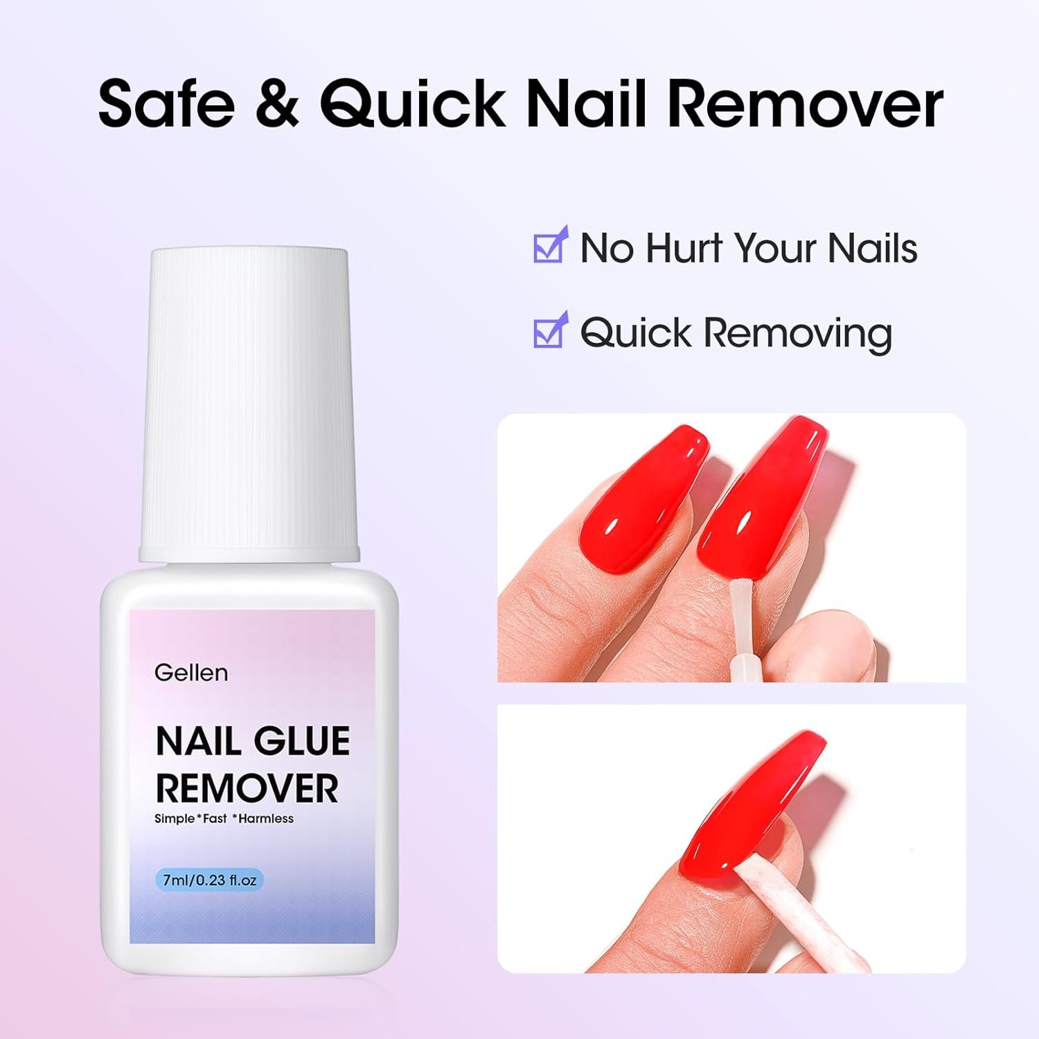 【Gentle Nail Glue Remover, NOT USE FOR GEL POLISH, for Press-on, Fake Nails, Nail Tips】: The Gellen nail glue remover, featuring a precision brush applicator, ensures rapid removal of false nail tips and press-on nail in just 5-10 minutes. Say goodbye to the hassle of soaking or salon appointments, streamlining the removal process for effortless convenience.