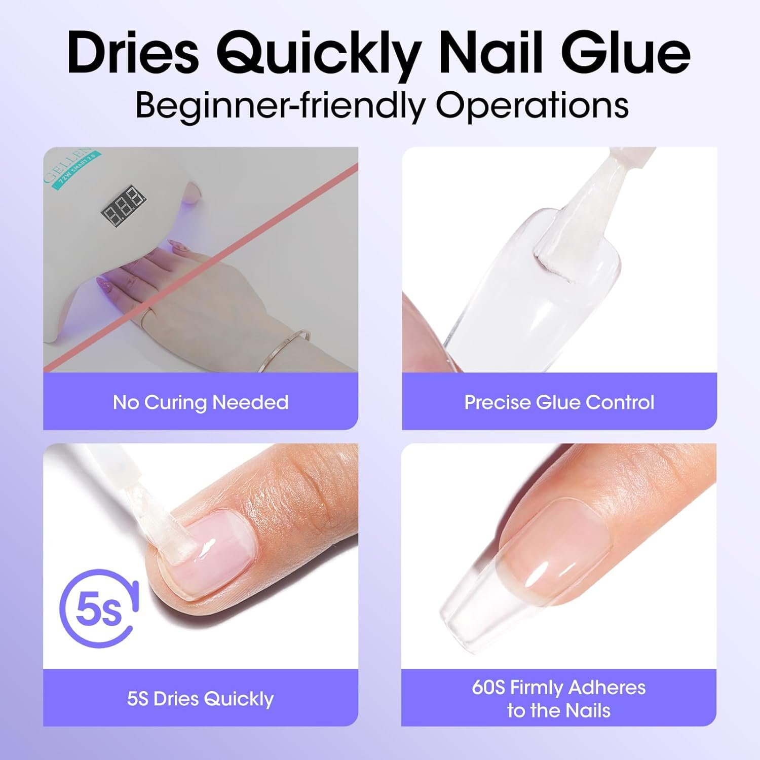【5s Quick Dry Nail Glue, No Curing Needed, Save Your Time】: The brush on nail glue is equipped with a precision brush to prevent any overflow during application, making it beginner-friendly. It provides quick process within 5 seconds and dries rapidly in the air. Moreover, this professional nail glue requires only a small amount for optimal results, effortlessly attach to press-on nails without causing any damage upon removal.