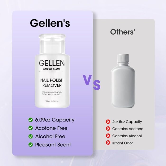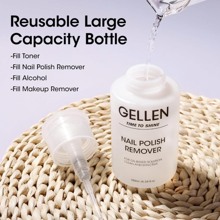 𝟲.𝟯𝟰 𝗢𝘇 𝗚𝗲𝗹𝗹𝗲𝗻 𝗡𝗮𝗶𝗹 𝗣𝗼𝗹𝗶𝘀𝗵 𝗥𝗲𝗺𝗼𝘃𝗲𝗿, 𝗟𝗶𝗴𝗵𝘁 𝗣𝗹𝗲𝗮𝘀𝗮𝗻𝘁 𝗦𝗰𝗲𝗻𝘁, 𝗥𝗲𝗹𝗮𝘅𝗶𝗻𝗴 𝗥𝗲𝗺𝗼𝘃𝗶𝗻𝗴 𝗘𝘅𝗽𝗲𝗿𝗶𝗲𝗻𝗰𝗲: The Gellen Nail Polish Remover, with a capacity of 180ml (6.34 Fl oz), is designed to effectively meet your daily nail polish removal needs. This gentle formula adds light pleasant scent and free from acetone and toxic substances, allowing for worry-free use on your nails and keep a good mood in removing. NOTE: this remover is specifically suitable for regular nail polishes and is NOT for gel nail polish.