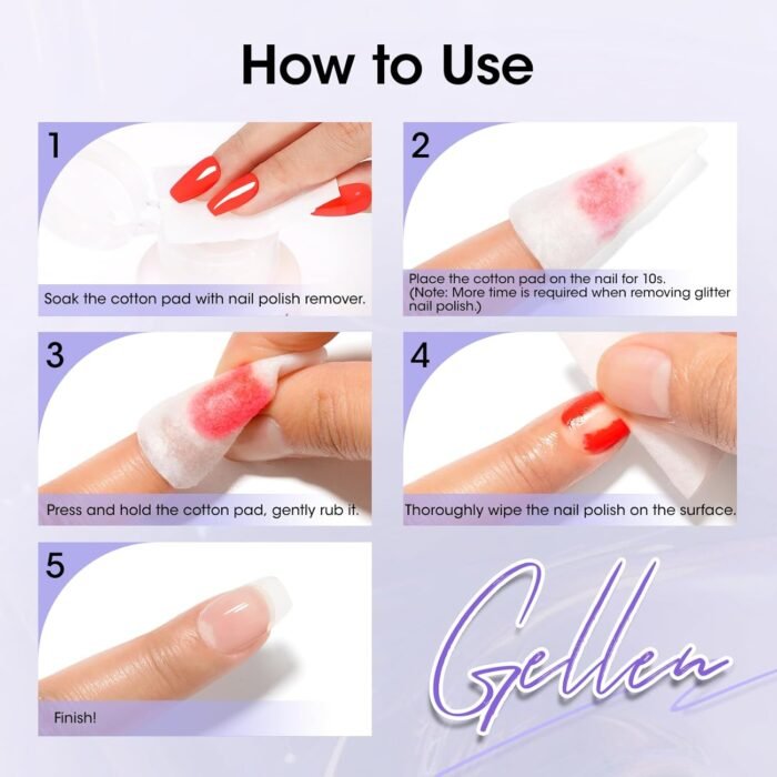 𝗛𝗼𝘄 𝘁𝗼 𝗨𝘀𝗲: Step 1:Soak the cotton pad with nail polish remover; Step 2: Place the cotton pad on the nail for 10s-20s. (Note: More time is required when removing glitter nail polish.); Step 3: Press and hold the cotton pad, gently rub it; Step 4: Thoroughly wipe the nail polish on the surface; Step 5: Finish!