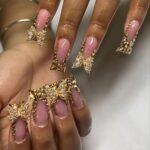 Press on Nails Medium Length Duckbill Design False Nails Gold Rhinestones Butterfly Coffin Nails Full Cover Artificial Nails Acrylic French Stick on Nails DIY Glue on Nails for Women Manicure Kit 24Pcs