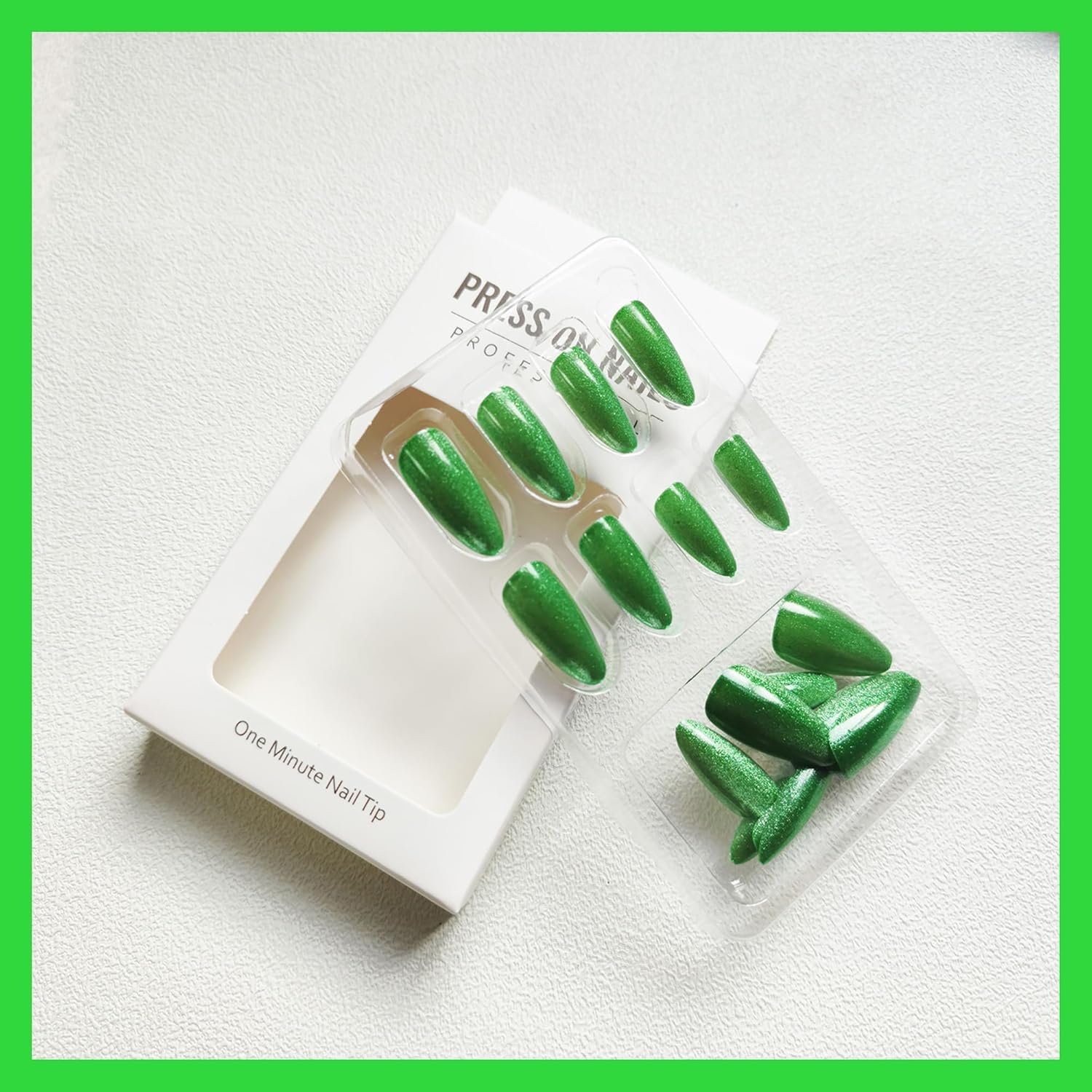 24Pcs Medium Fake Nails Almond Press on Nails Green Fake Nails with Gradient & Glitter Designs for Women and Girls Manicure