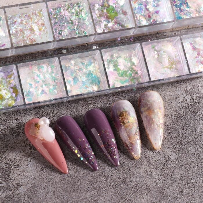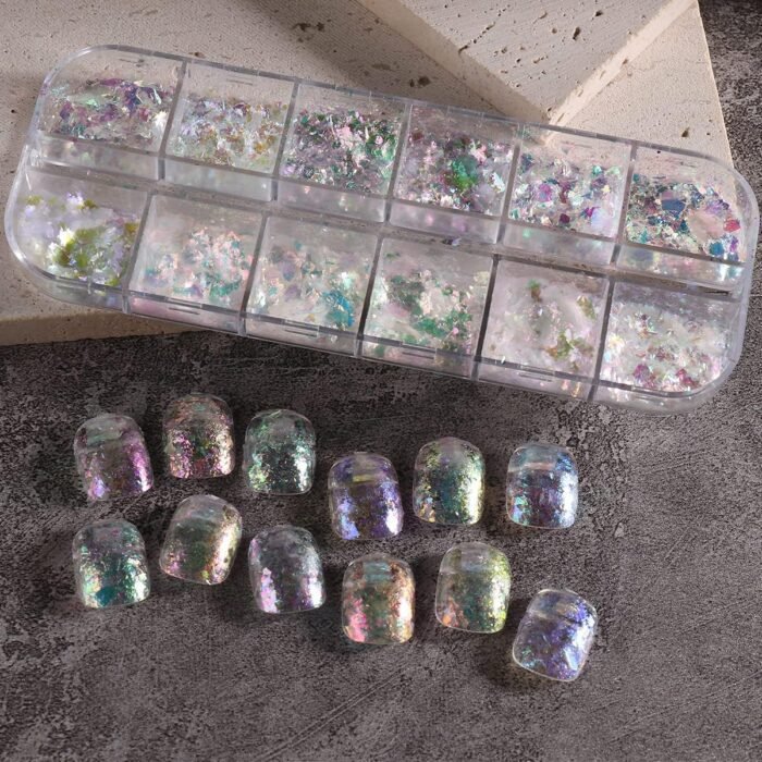 Package: You will get 1boxes 12 grids iridescent nails aurora glitter crystal fire flakes