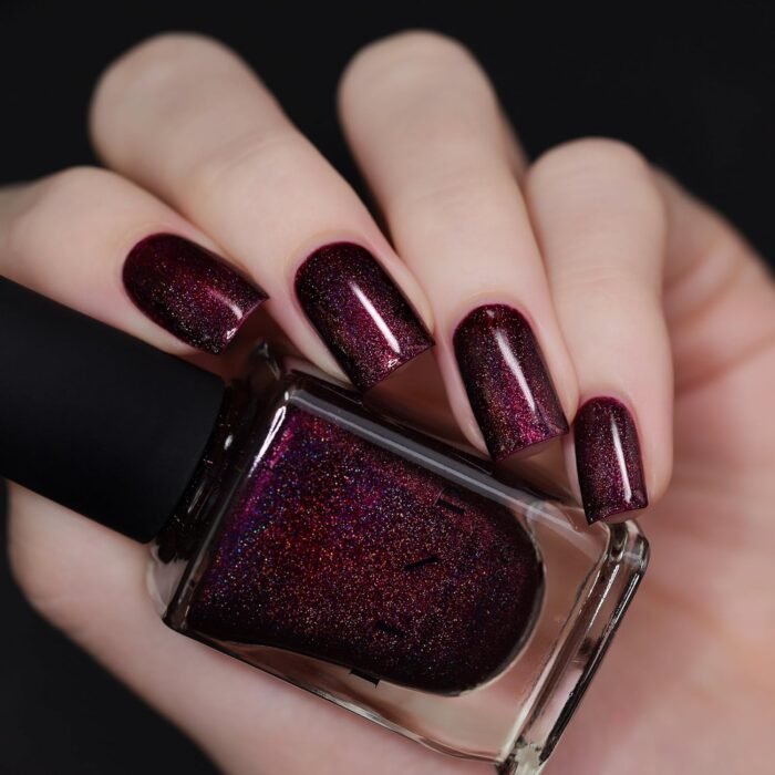 DEEP BURGUNDY HOLOGRAPHIC NAIL POLISH – Black Orchid is an absolutely gorgeous deep burgundy / purple holographic polish. It’s simply stunning under any type of light, indoor or outdoor.