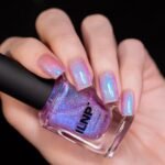 SOFT PINK SHIMMER NAIL POLISH – An unparalleled combination, Flower Child’s glowing blue shimmer contrasts beautifully against the soft pink to create a striking, luminous flair with a playful allure reminiscent of cotton candy. A delicate ratio of holographic flakes blossoms in sunlight to create a mesmerizing effect that dances with the light, offering a captivating finish at every angle.