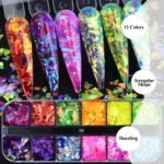 Iridescent Nail Art Glitter: You will get a box containing 12 colors of mermaid glitter nail decors in green, blue, yellow, pink, purple, red, etc. They are brightly colored and shaped, which are perfect accessories for everyday nail art designs.
