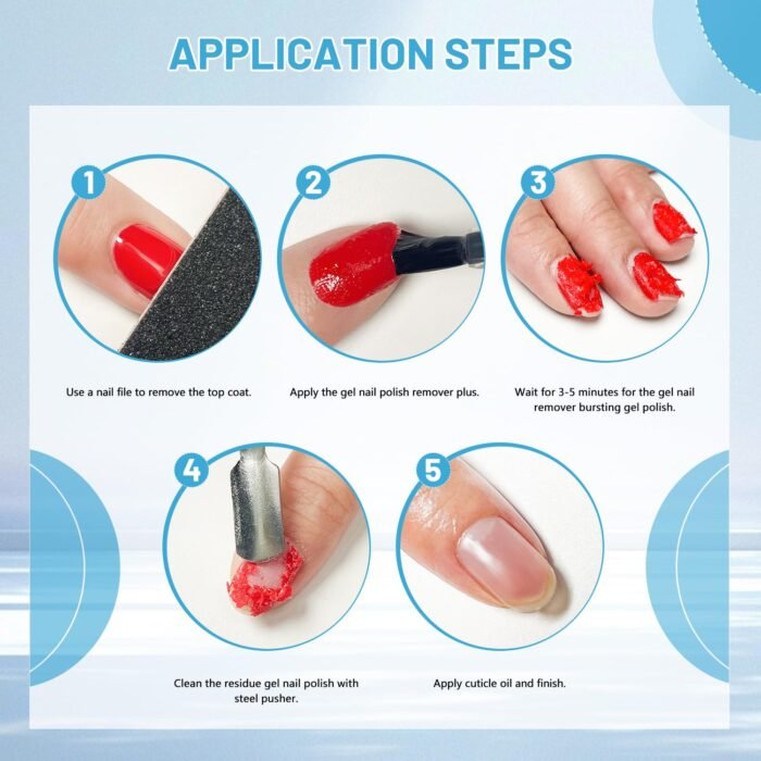 Buff Before Use – For optimal performance, always buff off the top coat/seal layer before applying the remover. This step allows the gel remover to penetrate and dissolve nail products quickly