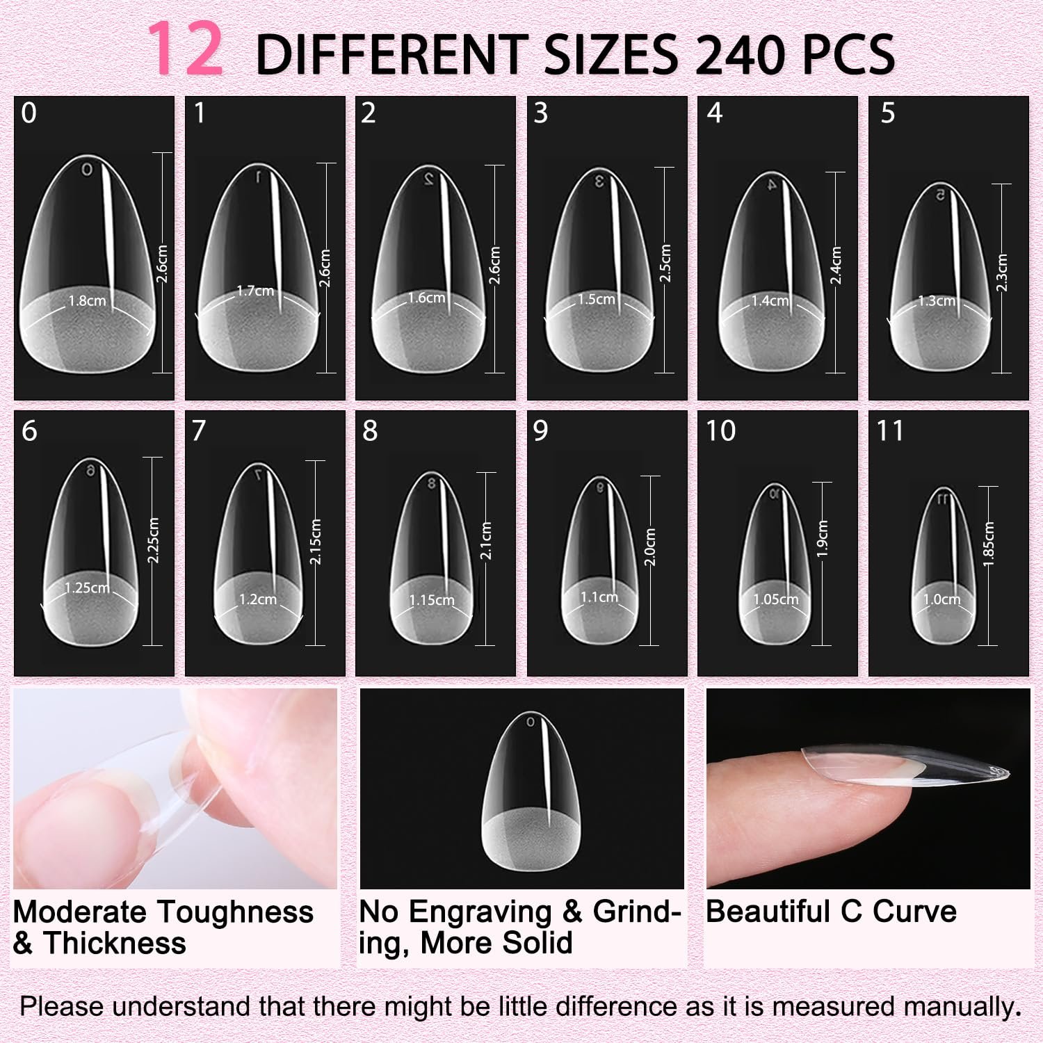 Premium Quality Nail Tips: Lavender Violets gel nail polish set includes 240 short almond nail tips made from high-quality PMMA material. These lightweight and durable tips provide a natural look and feel. Each nail extension set is numbered 0-11 for easy size selection, ensuring a perfect fit for every finger.