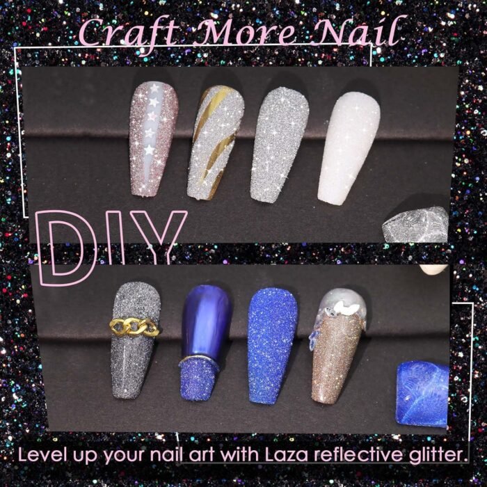 Laza crystal glitter are made of solid high-reflective material that are all shaped into micro triangle, so that they are more sparkling than common nail rhinestones. All diamond glitter for nails are evenly ground to fine reflective glitter, hence it can be attached to nails seamlessly without popping up.