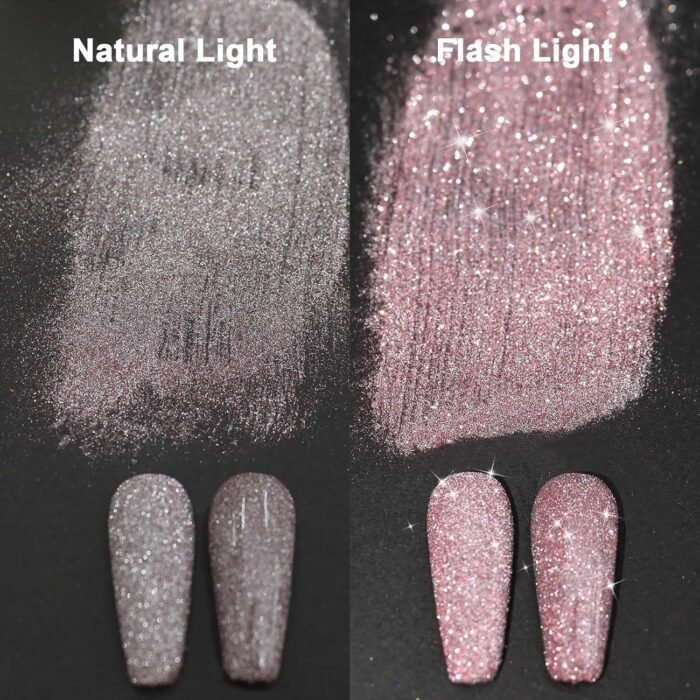The reflective glitter is an upgraded version that mixes vibrant pigment with diamond powder, which can create stunning reflective sparkles under flash light and make your nails shine like diamonds.