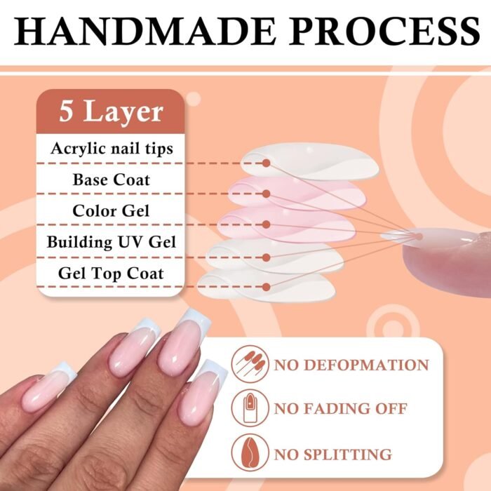 Square Press on French Nails: handcrafted long press on nails square fingernails offer you trendy natural nude color, shiny glossy finish, square shape, long length press ons nails. Stick on nails are made of quality material , long square nails press ons are flexible and durable. Nude false nails with thicker fingertip and thinner cuticle tips for durable comefortable wear, not easy to bend, break or crack.