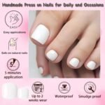 💅Quick and Easy Solution for Pedicure: Toe glue on nails with adhesive glue protect natural nails from staining and damage caused by frequent polishing, curing or removals, Moreover, White toe fake nails can also solve nail problems such as nails that are too short, too slanted, ungle nails, brittle nails and weak nails. White toe acrylic nails allow your natural toenails to rest and strengthen between applications.