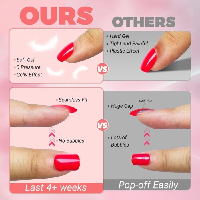 Thick Press on Nails Short Length: Light pink press on nails short square fake nails are made of high-quality acrylic material. Square shape press on nails light pink nail tips have a thin flexible back edge for a firmly seamless fot and comfortable wear. Acrylic press on nails short length also has a thick front fingertips for a strong and lasting wear, not easy to break, crack or clip. Shiny glossy fake nails like uv gel nails, gel press on nails can last shine without fade. No drying time means instantly camera-ready nails for any occasion.